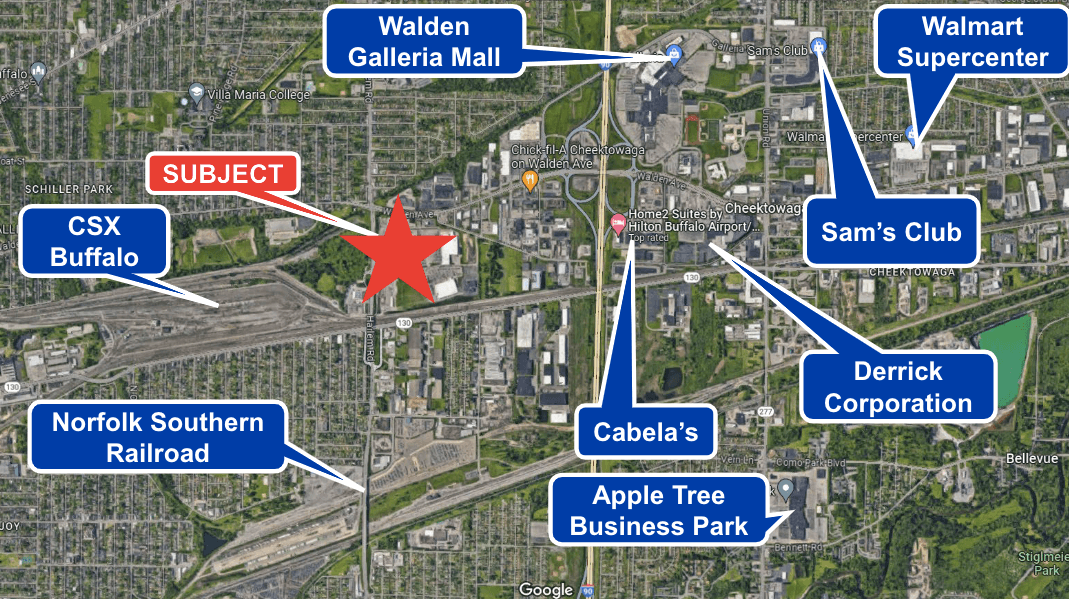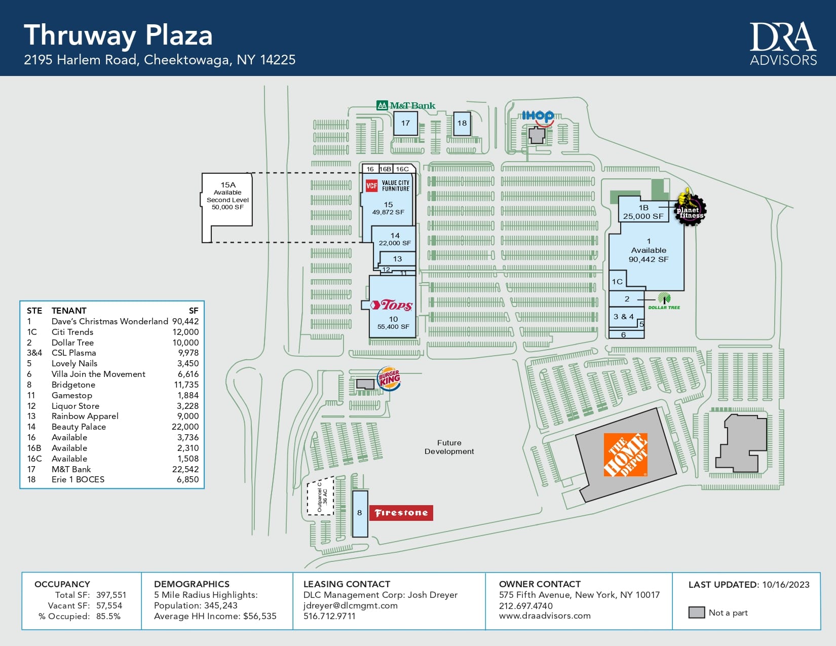 Thruway Plaza is a 217,279 square foot grocery anchored retail center located in Cheektowaga, NY. Cheektowaga is a town in Erie County, New York. Thruway Plaza includes national retail sellers including Tops Market and Value City Furniture. Located at the corner of Harlem Road and Walden Avenue, Thruway Plaza is located in a dominant retail corridor at one of the busiest intersections in the area. The center offers unattached visibility and access, with a signalized entrance along Walden Avenue, and 4 curb cuts along Thruway Plaza drive, which is an access road directly off Harlem Road.